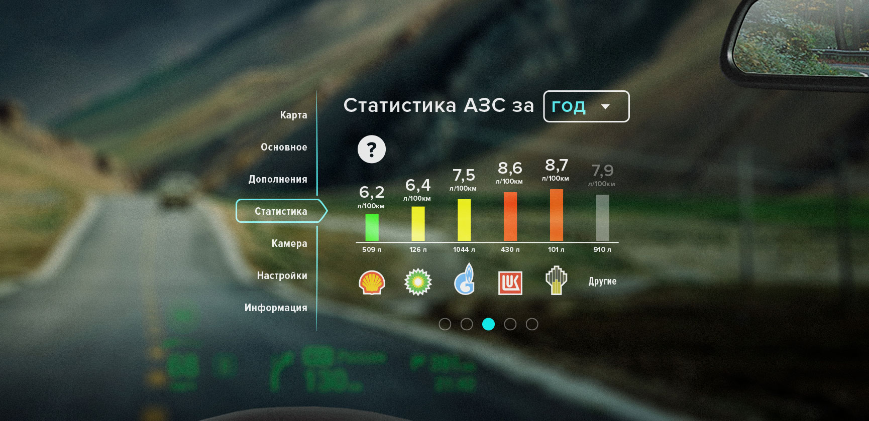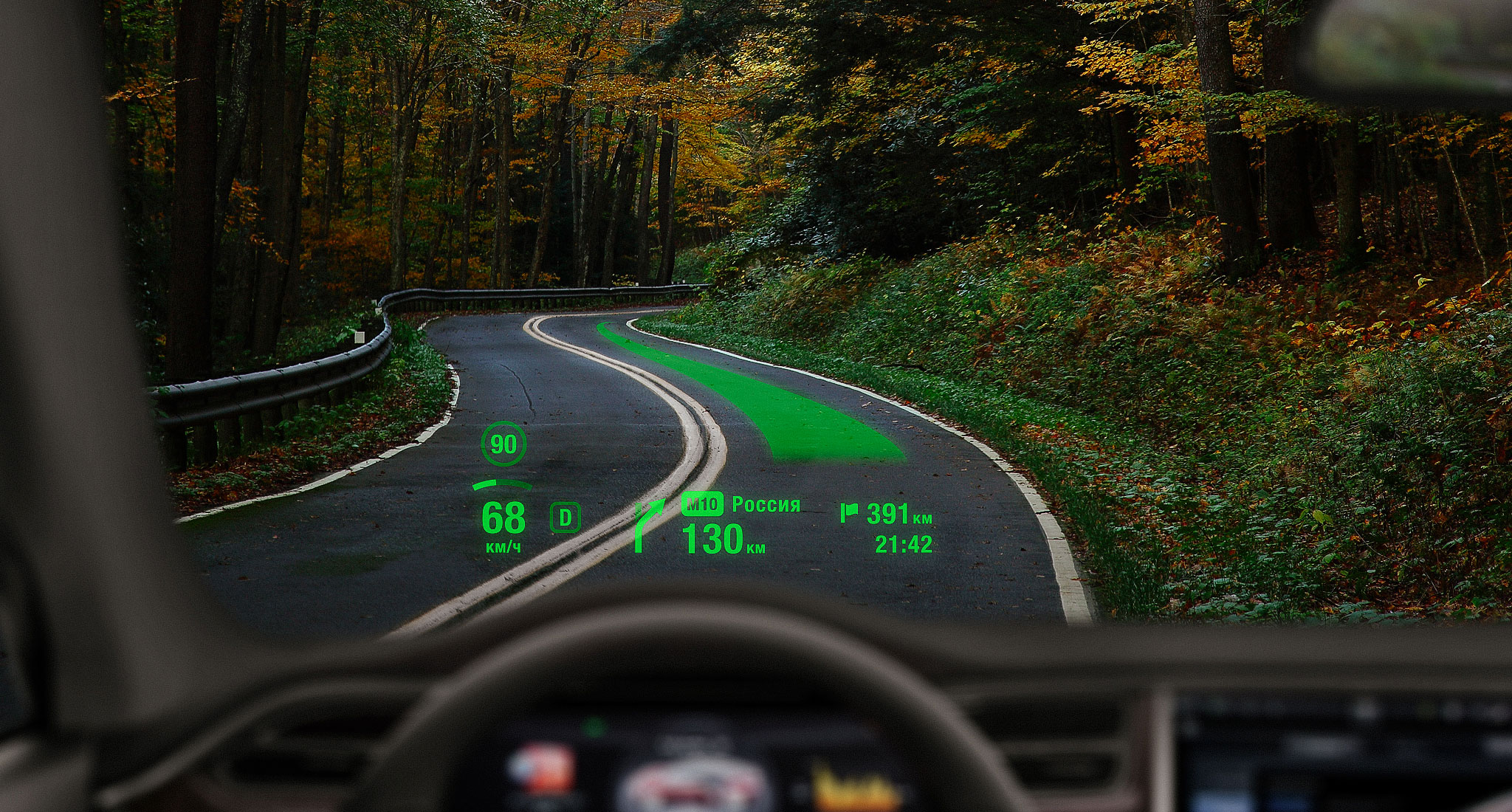 и элементами дополненной реальности. Информация проецируется прямо на лобовое стекло автомобиля. Область дисплея находится сразу под уровнем горизонта.