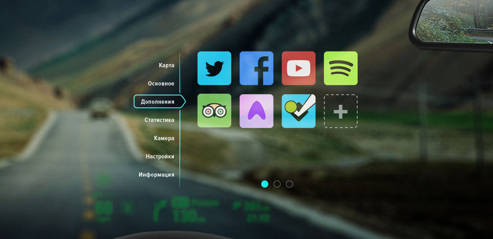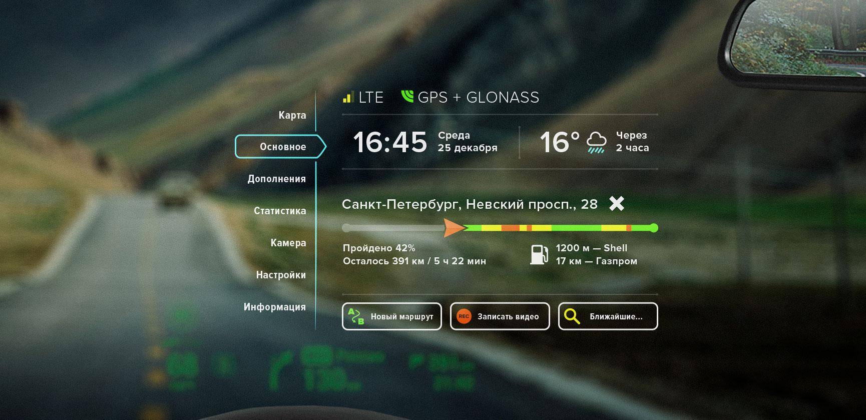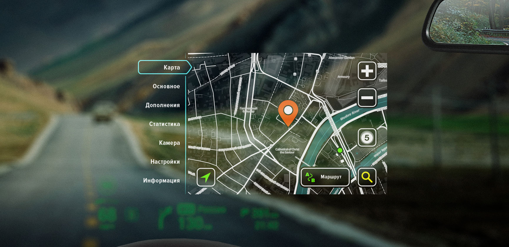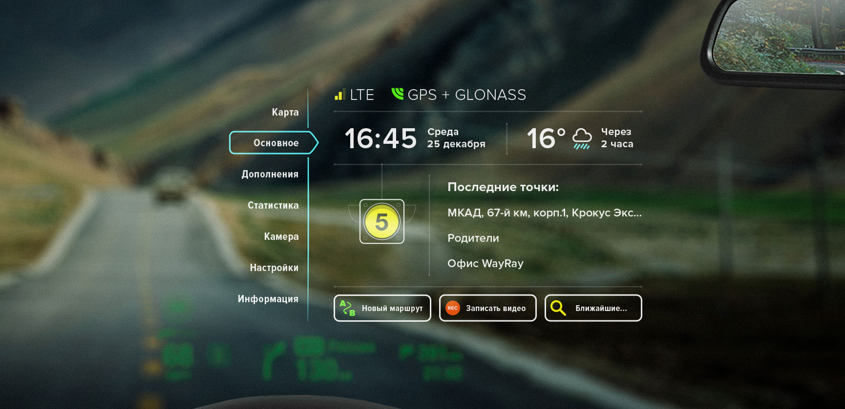и элементами дополненной реальности. Информация проецируется прямо на лобовое стекло автомобиля. Область дисплея находится сразу под уровнем горизонта.
